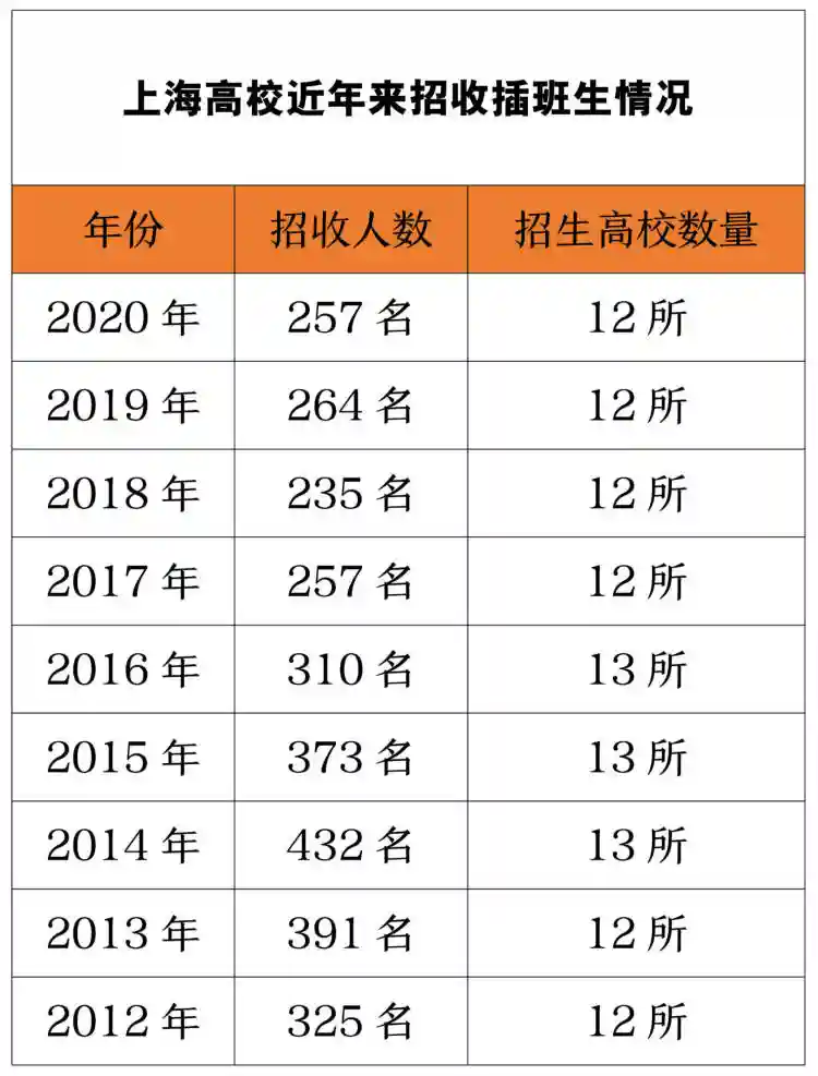 上海的部分高校开展插班生招生试点工作已经多年。近年来,试点招收插班生的高校数量基本稳定在12所。