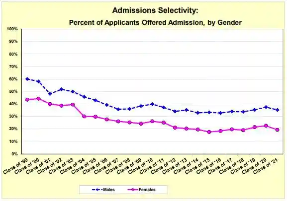 在常春藤名校中,在录取率上性别差异最大的是布朗大学。2018-19学年的新生中,女性的申请成功率为6.5%,而男性则高达9.4%。